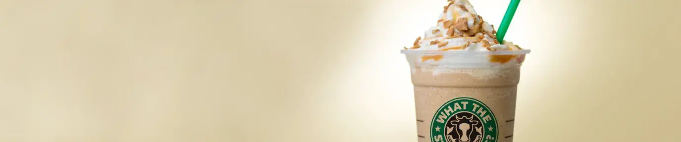 Image: iced frappucino in a cup that says What the Starbucks?