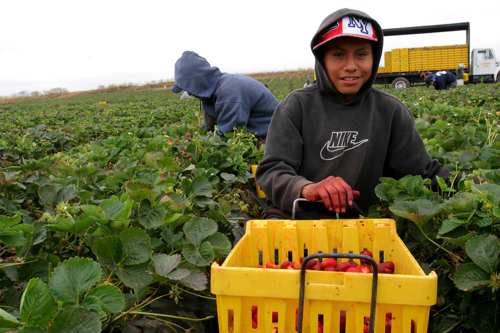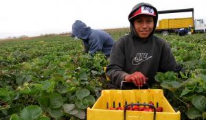 Caption for header photo: A boy picks strawberries in a crew of Mixtec migrants from Oaxaca. He says he’s 18 years old, a claim he’s been told to make if a photographer takes his picture. Photo by David Bacon.