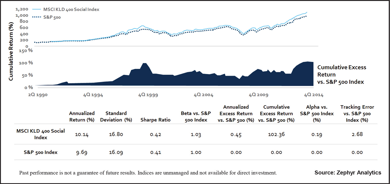 This graph from the Morgan Stanley Institute for Sustainable Investing shows how the MSCI KLD 400, the world’s oldest socially responsible investment index, has outperformed the S&P 500 since its inception. Graphic by Zephyr Analytics